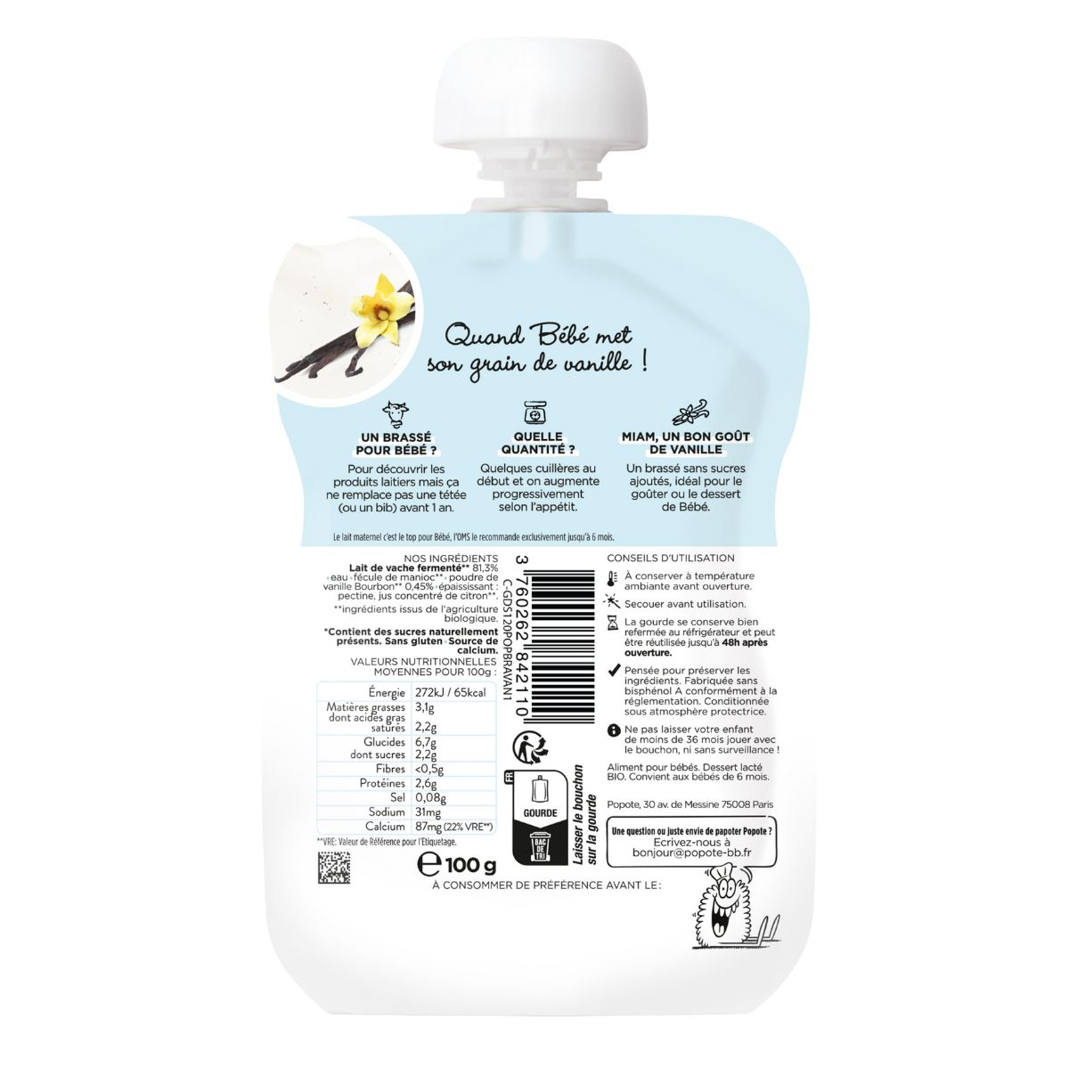 Realizat din peste 80% lapte de vaca fermentat, acest iaurt este o sursa excelenta de calciu, un mineral esential pentru dezvoltarea sanatoasa a oaselor si dintilor bebelusului. Laptele integral oferit de Popote provine din ferme ecologice din Franta si este apreciat pentru continutul ridicat de grasimi bune si proteine usor digerabile. Completat cu pudra de vanilie Bourbon organica, iaurtul capata un gust parfumat, delicat si natural, potrivit pentru papilele sensibile ale celor mici.